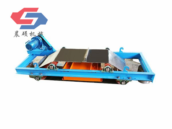 電磁除鐵器的基礎上增加了驅動電機、滾筒、帶刮板的缷鐵膠帶等組成的缷鐵機構。在工作過程